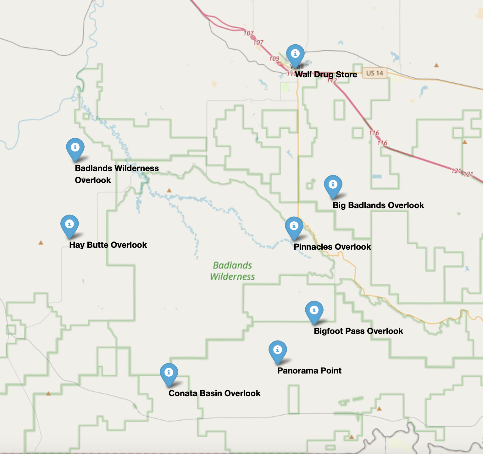 Die Badlands Loop Road ist die einzige befestigte Straße durch den Park und erstreckt sich über 23 Meilen (37 km) von der Pinnacles Entrance im Norden bis zum Ben Reifel Visitor Center im Südosten. Entlang dieser Straße gibt es mehrere malerische Aussichtspunkte, darunter meine unten im Detail beschriebenen Highlights.
